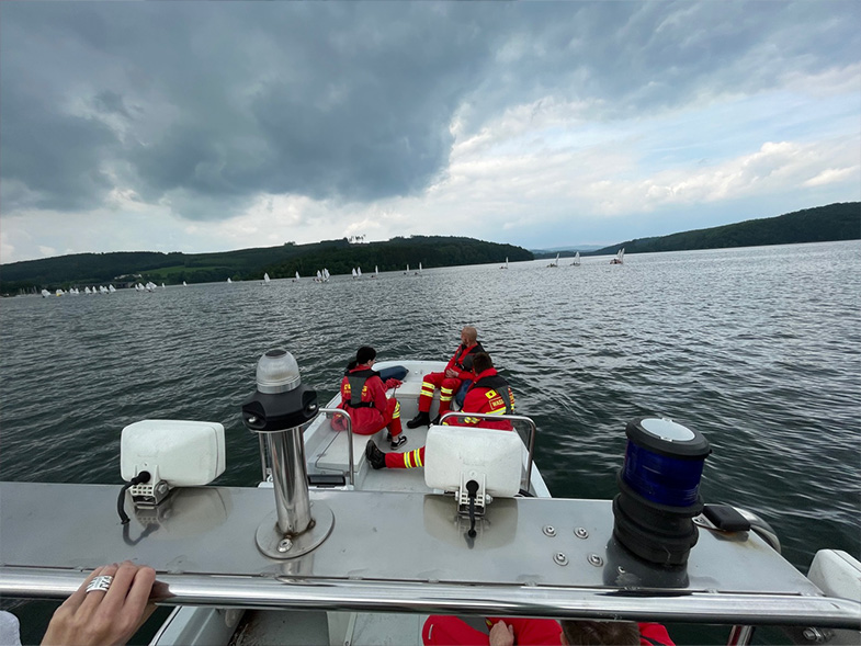 Insgesamt verfügt das Team über zwei Einsatzfahrzeuge und zwei Rettungsboote. An diesem Sommertag bewachten sie eine Segelregatta der Jugend. Stephan Ochsenfeld und Georg Japes waren beeindruckt vom Zusammenhalt der Ortsgruppe, die mit 200 Mitgliedern aus Jugendlichen und schon erfahrenen Einsatzkräften besteht.